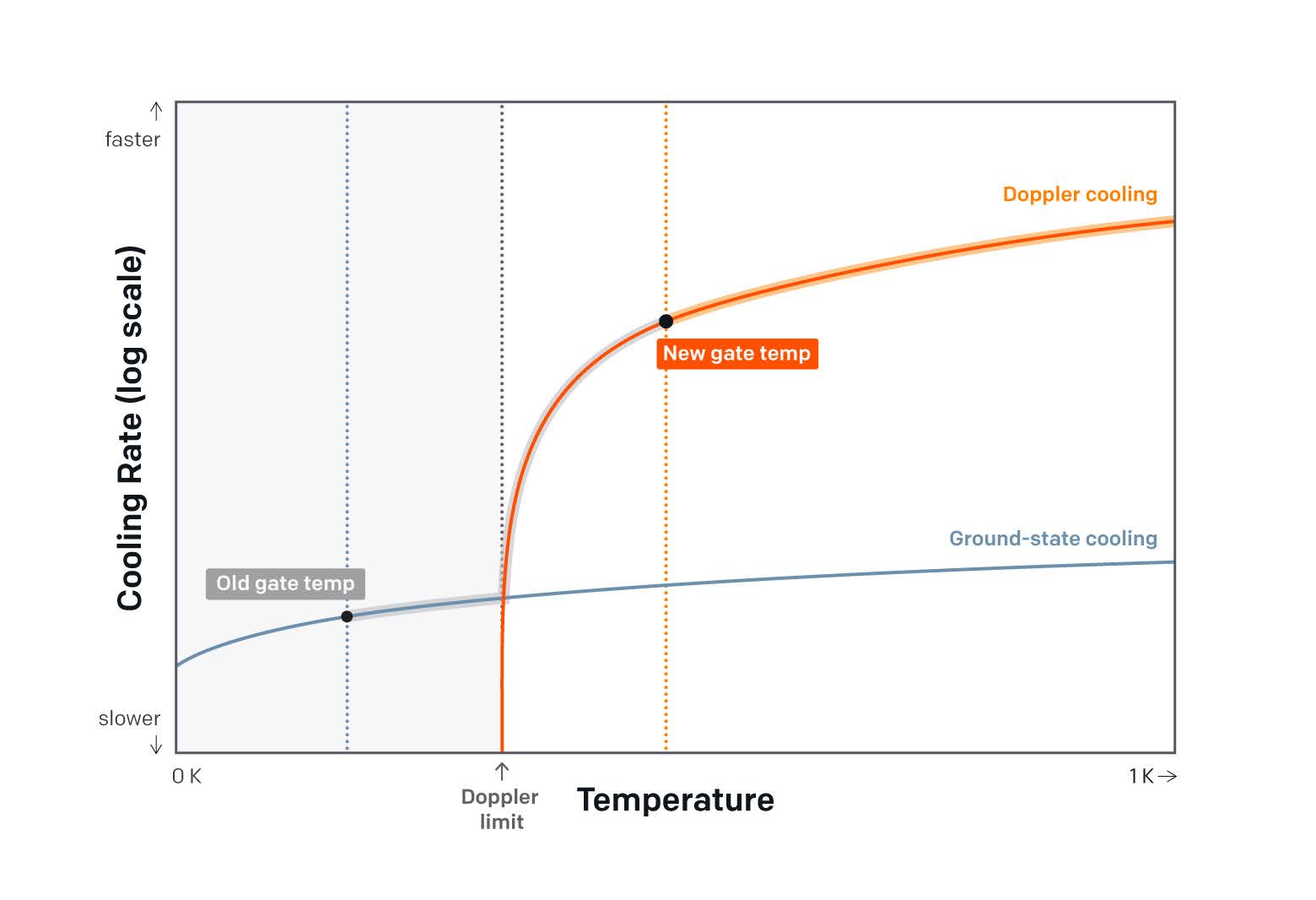 Illustrative plot of the relationship between ion temperature (x-axis, linear) and cooling speed (y-axis, logarithmic), showing how increasing the required gate temperature by a fraction of a Kelvin to above the Doppler limit drastically reduces the amount of slow cooling required, which therefore significantly decreases the total cooling time.