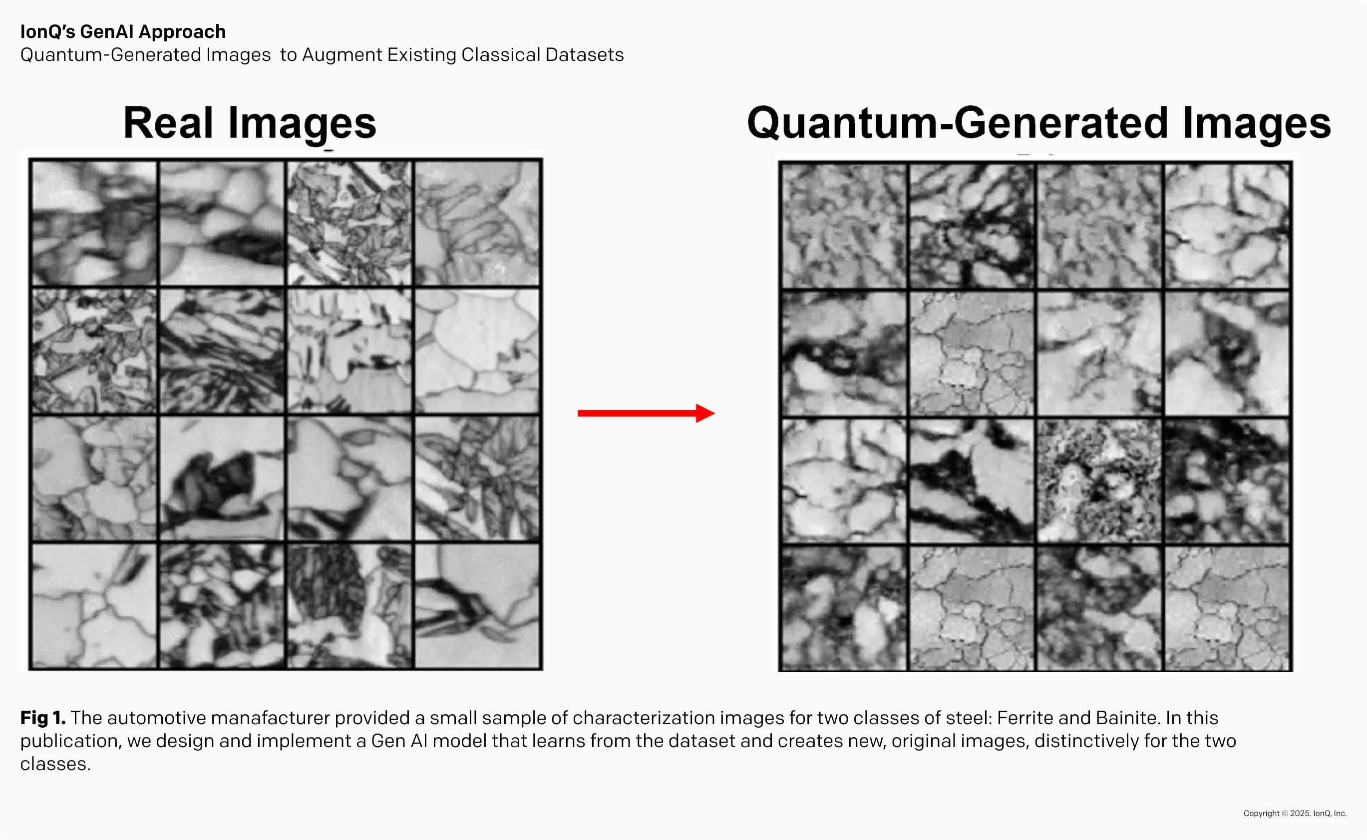 IonQ’s quantum hardware can help overcome these challenges with quantum-enhanced generative models to artificially generate new, high-quality images. Using a hybrid quantum-classical Generative Adversarial Network (GAN), the team created synthetic micrographs that expand the dataset while preserving the unique characteristics of ferrite and bainite steel classes. This approach not only improves model performance but also demonstrates the power of quantum computing in tackling complex data scarcity issues in industrial applications.
