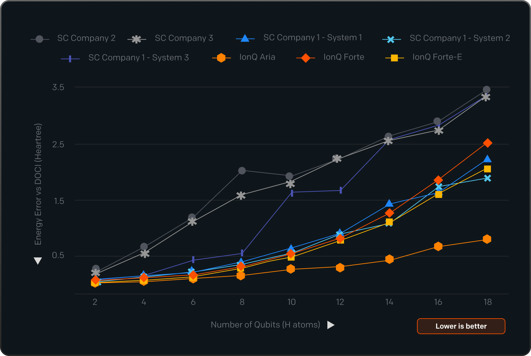 This benchmark asks the quantum system to compute the lowest energy state of a molecule. The correct answer is already known from classical calculation. That makes it a clean test: run the quantum circuit, compare the result to ground truth, and the gap tells you exactly how much noise the hardware introduced.